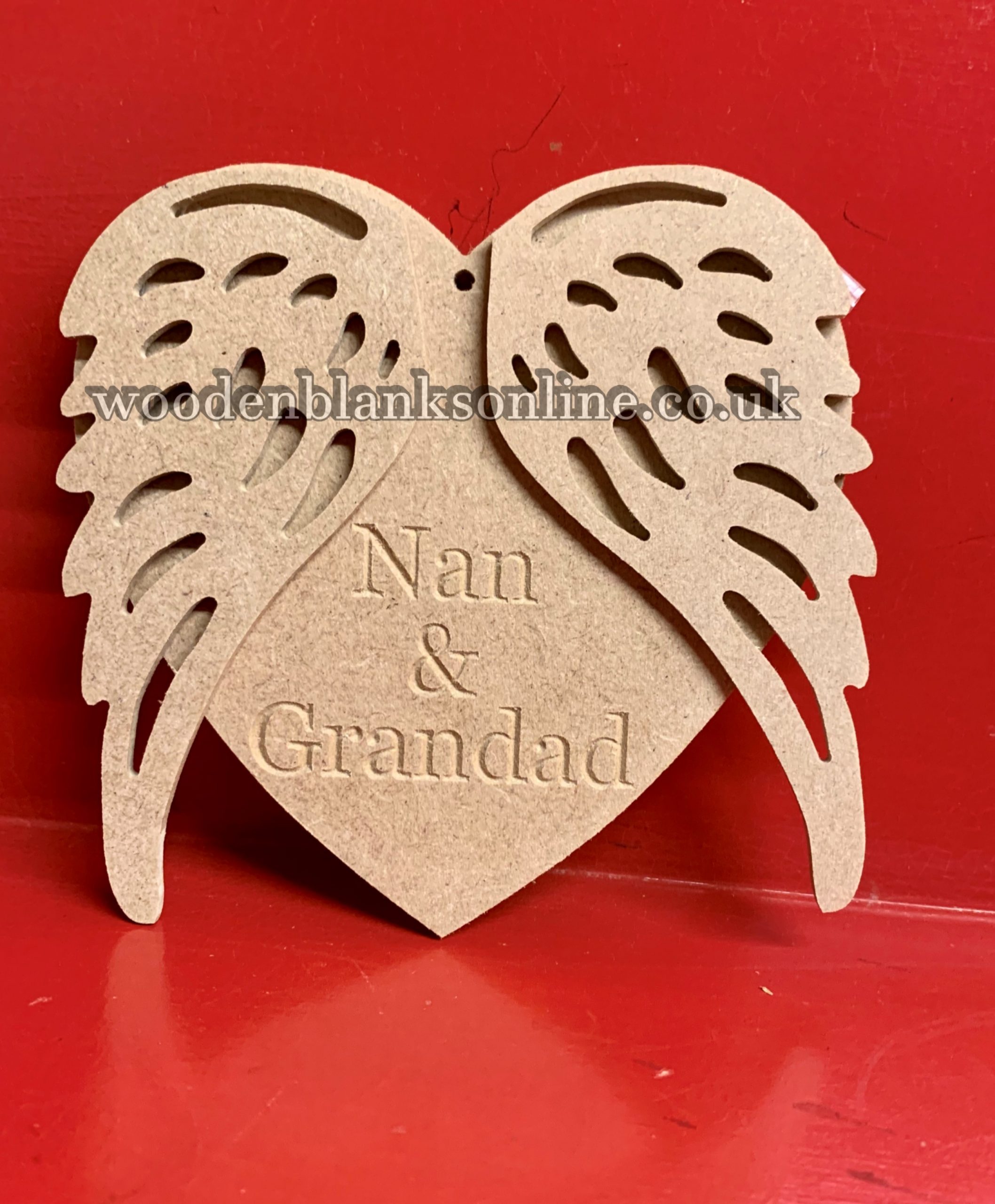 125mm x 6mm mdf heart engraved Nan & Grandad,with 3mm angel wings overlay